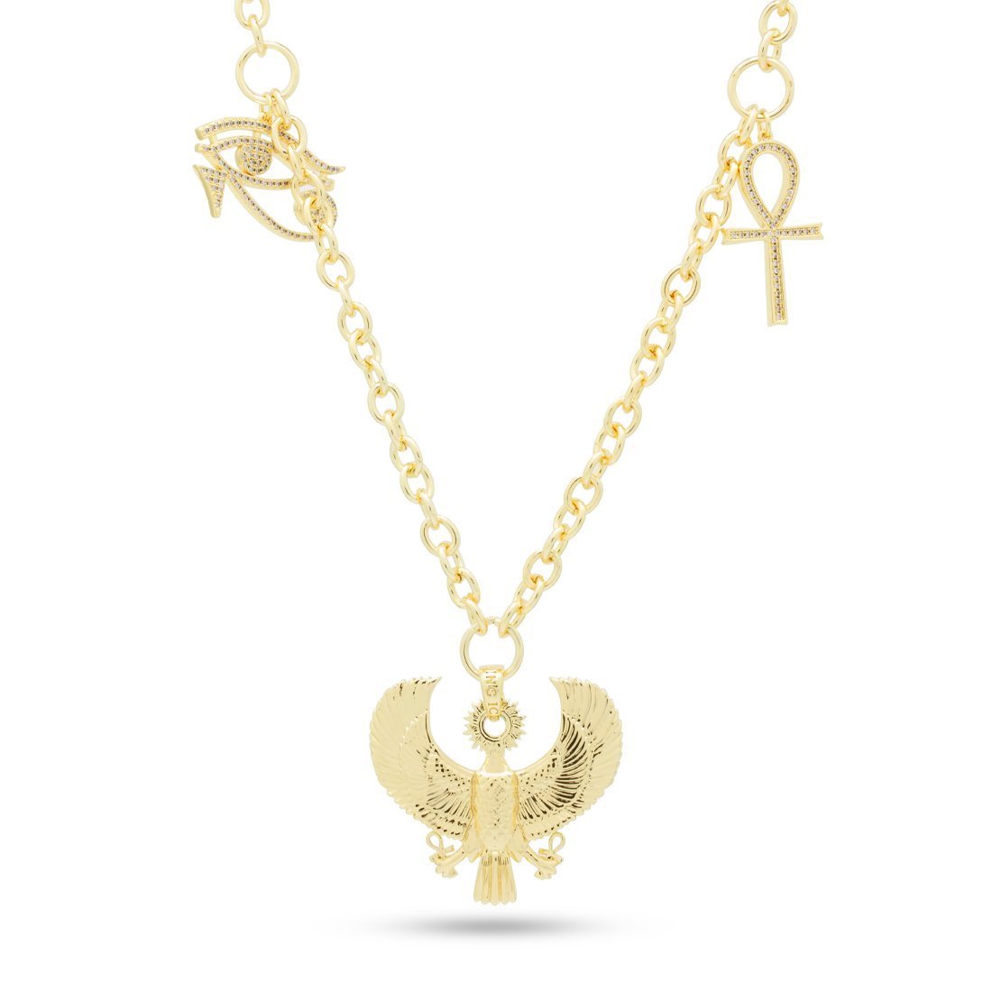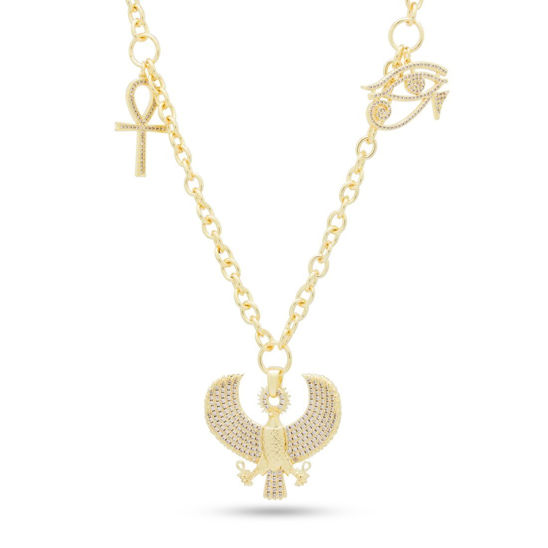 This combination of the Tutelary Falcon, the Ankh Cross, and the Eye of Horus represents nothing but positivity. In Ancient Egypt, the Eye of Horus represents protection, power, and good health. The Ankh is the symbol of life and living. The falcon symbolizes a spirit who is a guardian or protector. Over 500 CZ stones are on the necklace for a bright look. The necklace is available in 14K Gold plating and white gold plating. The unity necklace comes with an attached cable chain for a comfortable fit.