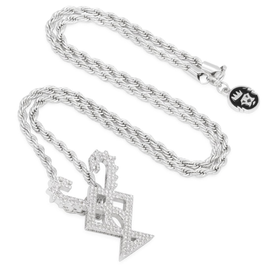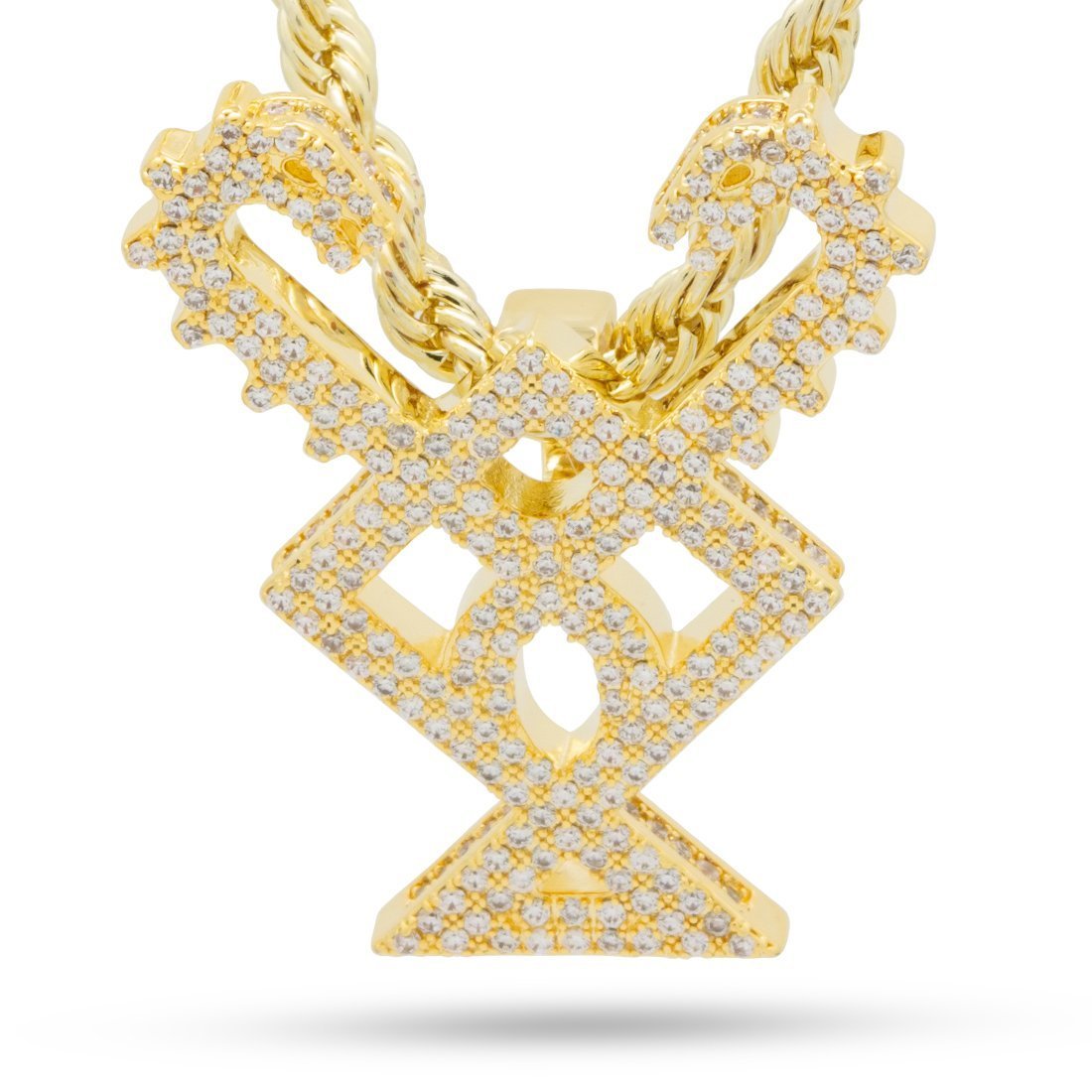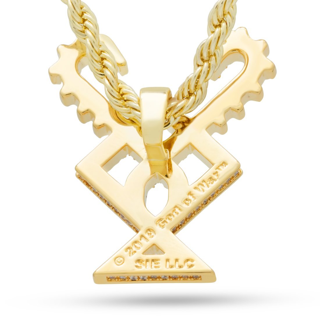 The classic Huldra symbol from God of War is iced with handset CZ stones. The piece is available in a 14K Gold plated version, as well as white gold. Each pendant is paired with a 4mm, 20" Rope Chain.