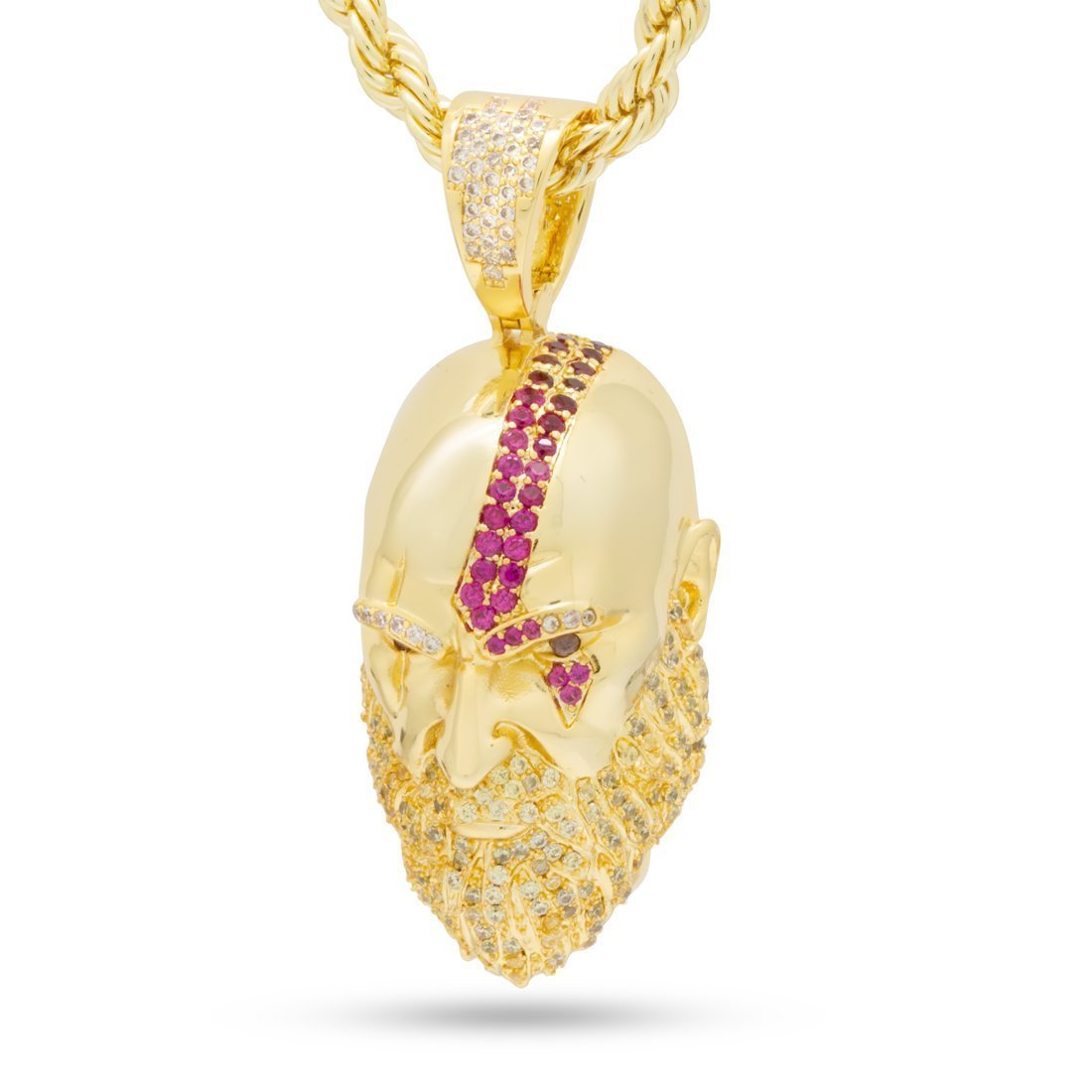 Recognized as the "Ghost of Sparta", the new 14K Gold plated Kratos Necklace is designed to look identically like him. Ruby red VVS Diamond Simulates detail his recognizable tattoo on the left side of his face and engraving details his scar that goes over his right eye. His facial hair is also iced with VVS Diamond Simulates. Each piece comes with 4mm 20" Rope Chain.