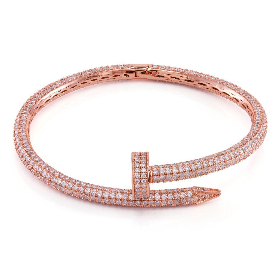 Plated to perfection, each Iced Studded Nail Bracelet comes lined with VVS Diamond Simulate Stones to provide a classic look. Available plated in 14K Gold, White Gold, or Rose Gold.