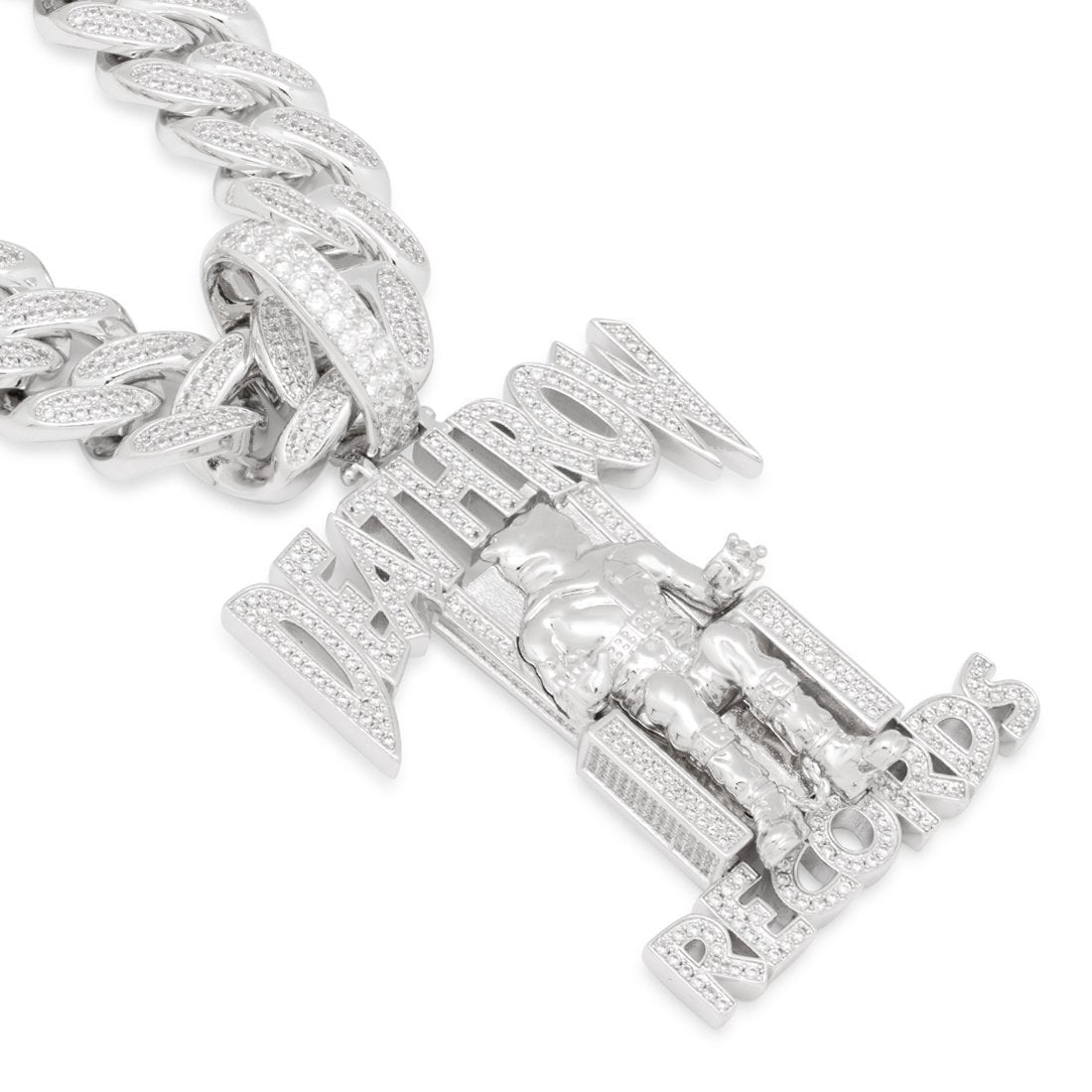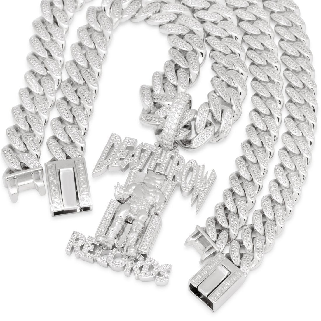Part of the second official King Ice x Death Row collab drop, King Ice introduces this exclusive chain set. It's the classic XL size Death Row Records logo with two thick Miami Cuban chains. The pendant comes paired with an 18mm, 20" chain and the second chain measures 15mm and 18" for a shorter fit. These chains have more than 2,000 handset CZ stones. The pendant has more than 400 handset CZ stones for an even icier look. The chains come with a custom Greek Key box clasp for a secure and comfortable wear.