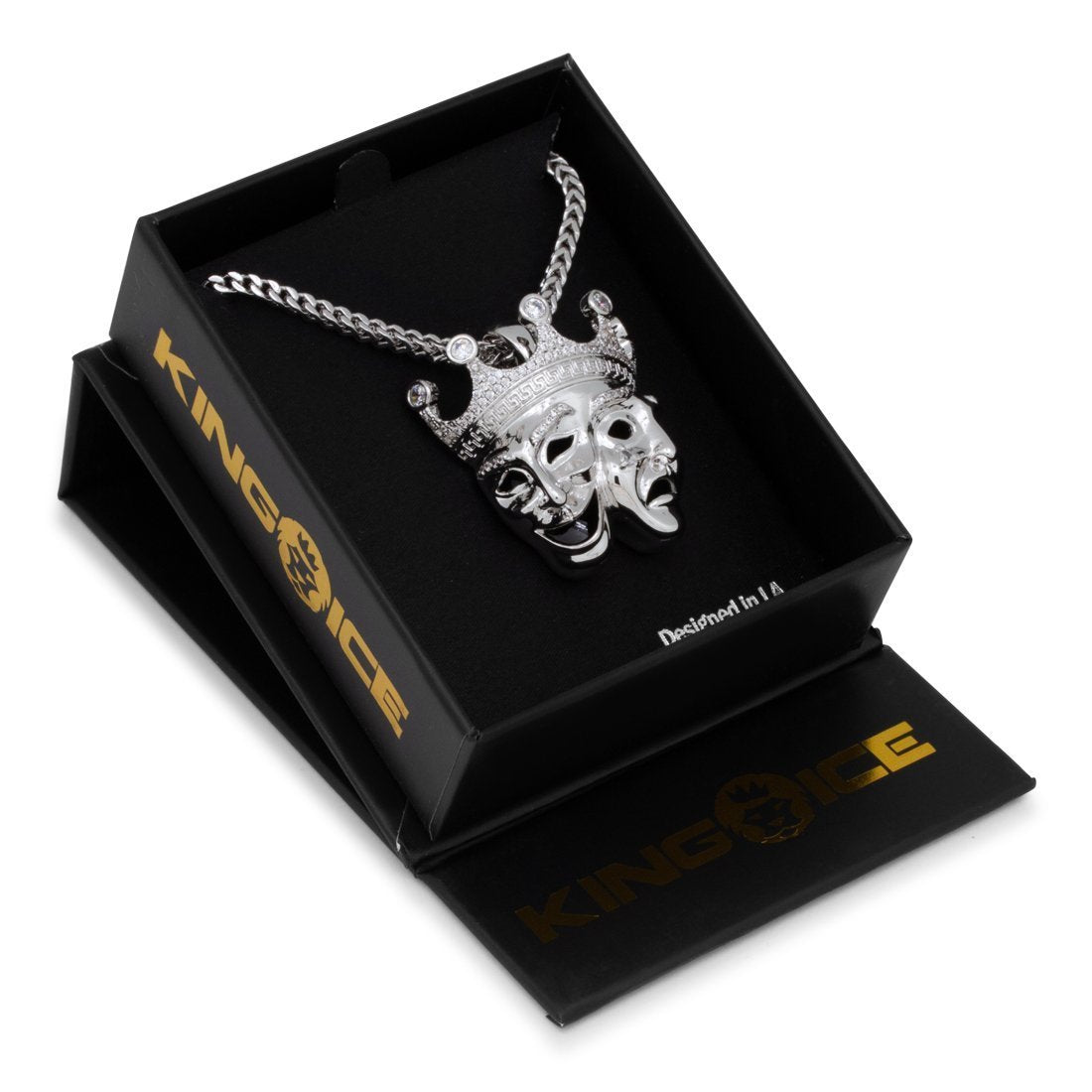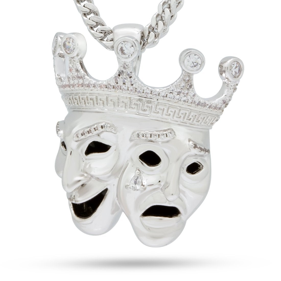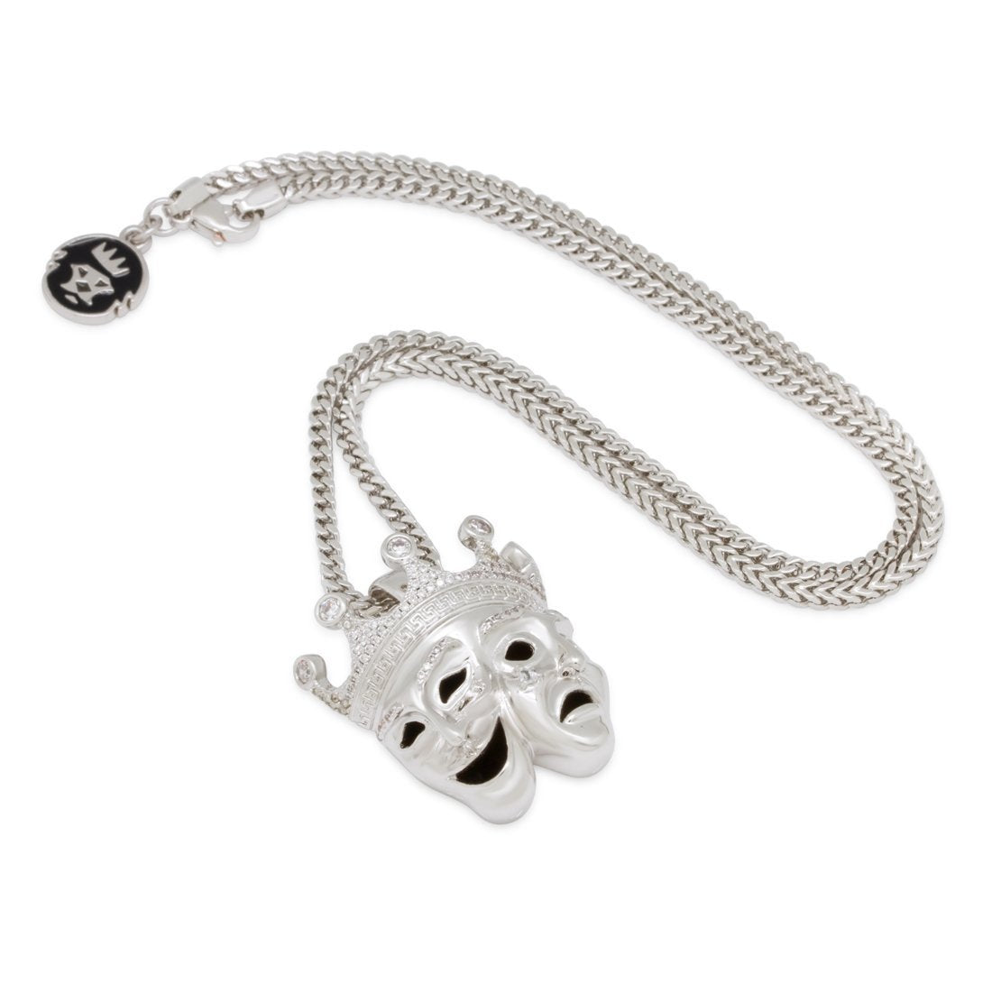 Also known as Comedy and Tragedy in Greek Theater, the masks are now popular for hiding the pain behind a smile. The pendant is available in 14K Gold plating and white gold plating and CZ stones that provide a vibrant display. The pendant is paired with a 2.5mm, 20" Stainless Steel Franco Chain.