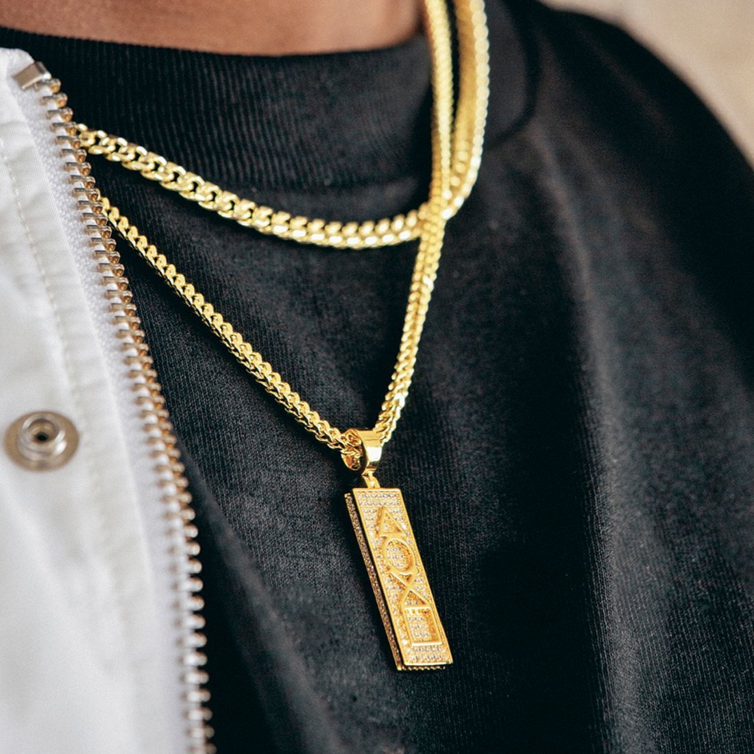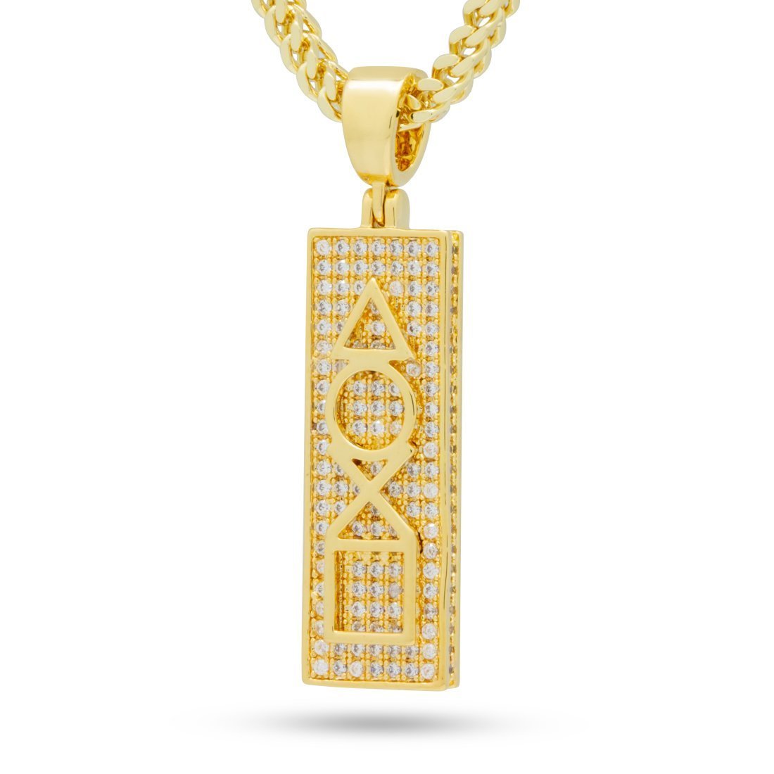 King Ice pays homage to these classic buttons, using 14K Gold plating and VVS Diamond Simulates for a vibrant look. Each piece is paired with a 2.5mm, 20" Stainless Steel Franco Chain.