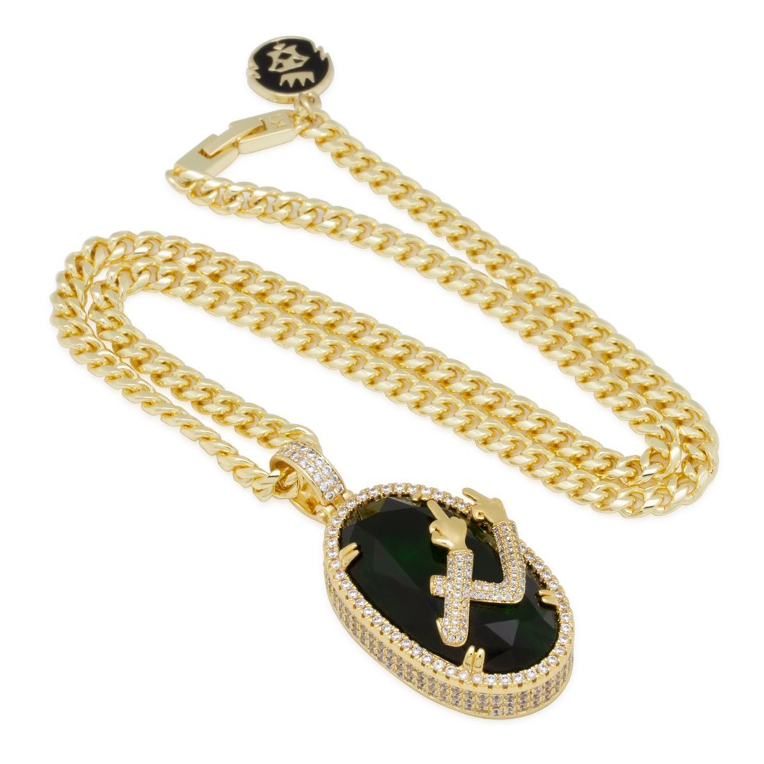 Part of the official Rick and Morty x King Ice collab, the infamous Portal Flip Necklace has a large green VVS Diamond Simulate stone, equipped with the ultimate flip detailing. Small clear stones cover the rest of the pendant, shining bright with the 14K Gold plating. Each pendant comes with a 5mm 20" Miami Cuban chain.