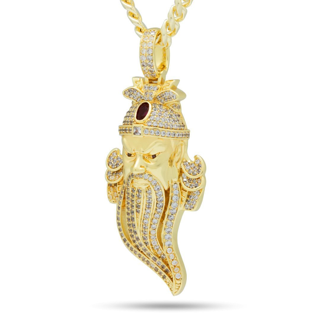 Known as the God of War during the Eastern Han Dynasty in China, Guan Yu was a warrior for his people. Many knew him to be courageous, strong and loyal. Now, King Ice pays tribute with an iced Guan Yu necklace. Each necklace is plated with 14K Gold and VVS Diamond Simulates border Yu's design. A red ruby simulate brightens Yu's head wear for extra color. The back of every pendant has "loyalty" and "integrity" engraved in Chinese to complete Guan Yu's necklace. Each small necklace is accompanied with a 5mm, 20" Miami Cuban Chain and each large comes with an 8mm, 20" Miami Cuban Chain.