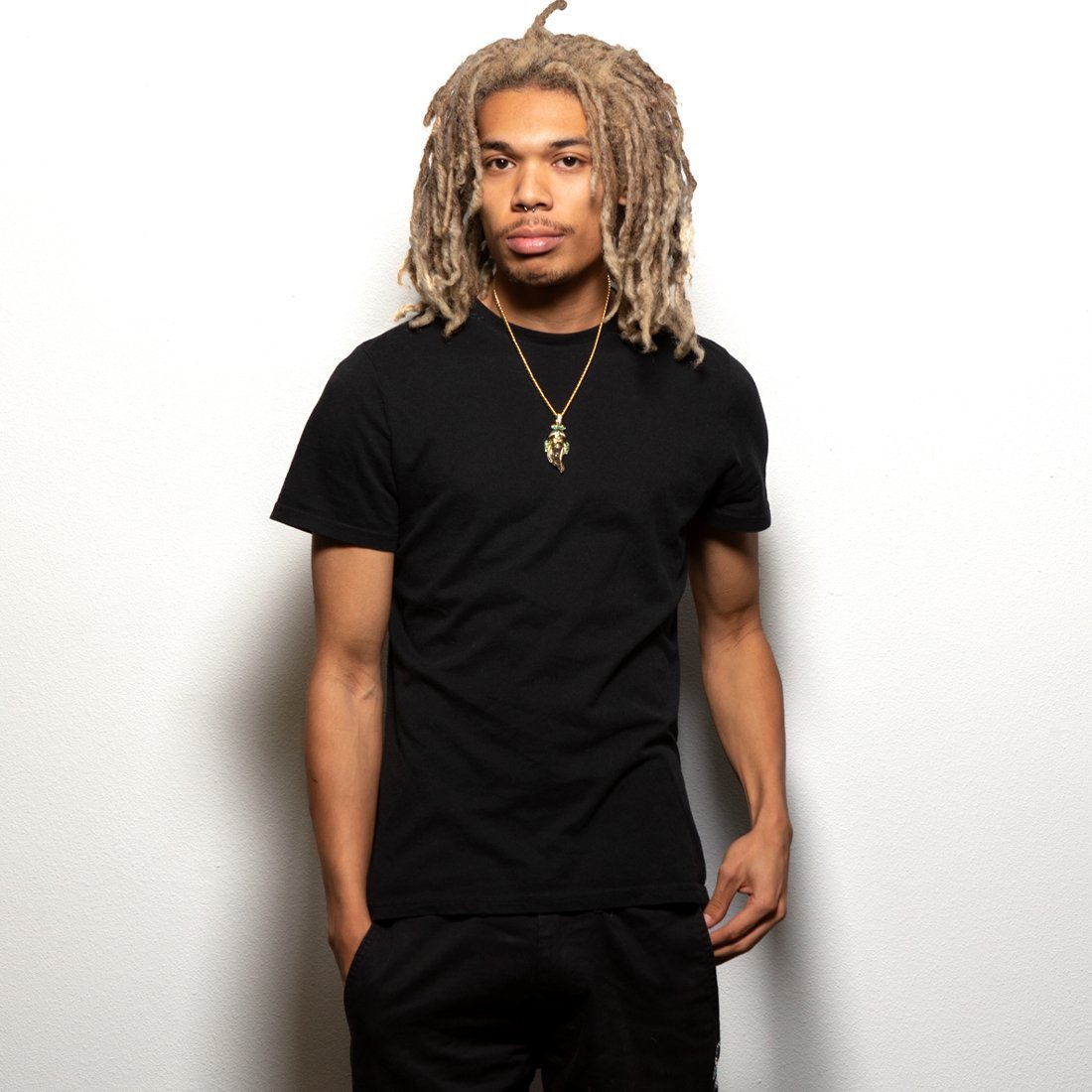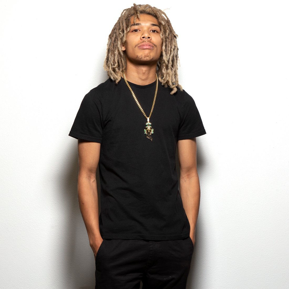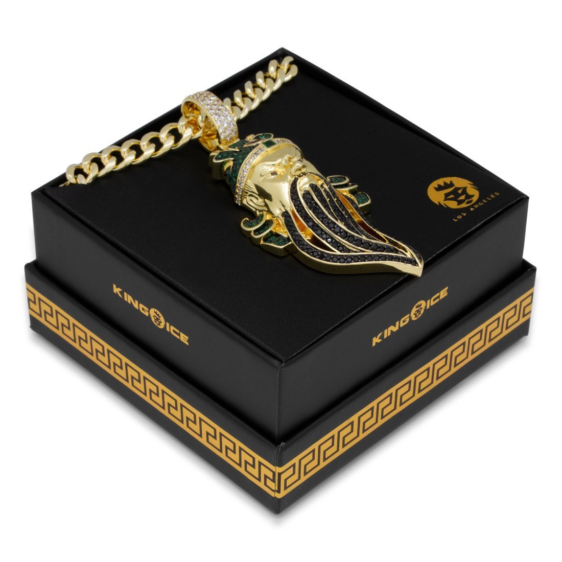 Known as the God of War during the Eastern Han Dynasty in China, Guan Yu was a warrior for his people. Many knew him to be courageous, strong and loyal. Each necklace is plated with 14K Gold and colorful VVS Diamond Simulates border Yu's design. A red ruby simulate brightens Yu's head wear for extra color. The back of every pendant has "loyalty" and "integrity" engraved in Chinese to complete Guan Yu's necklace. Each necklace is accompanied with a 5mm, 20" Miami Cuban Chain.