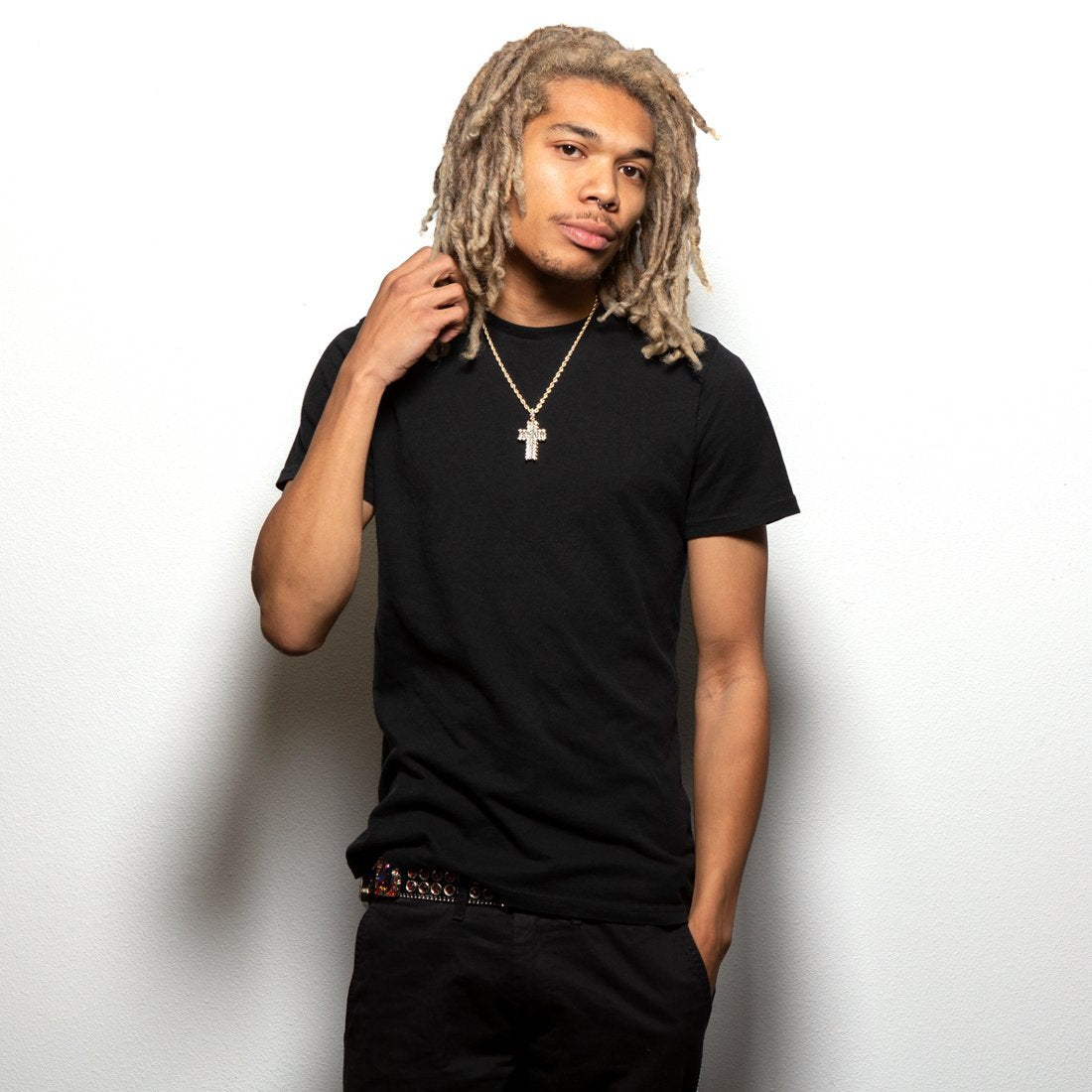 The new Icy Cross Necklace is exactly that, icy. Each necklace is decked out with clear VVS Diamond Simulates in round and emerald shapes. All necklaces are plated with a 14K Gold finish for a flossy finish. A 4mm, 20" Rope Chain accompanies each cross.